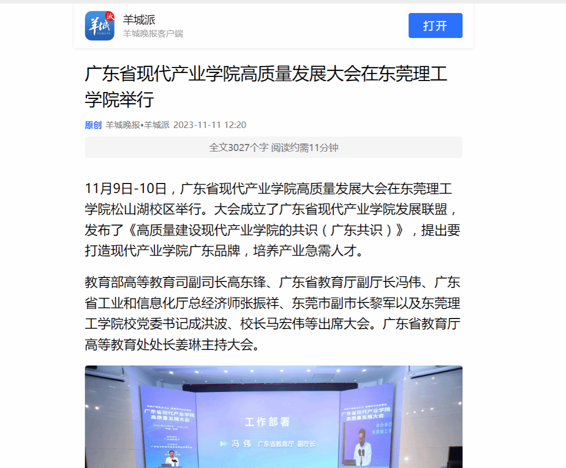 11月9日-10日,广东省现代产业学院高质量发展大会在45612藏宝阁资料松山湖校区举行。大会成立了广东省现代产业学院发展联盟,发布了《高质量建设现代产业学院的共识(广东共识)》,提出要打造现代产业学院广东品牌,培养产业急需人才。