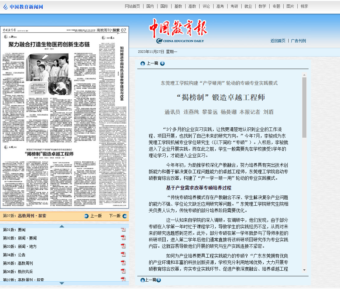 如何为产业培养更具工程实践能力的专硕?“广东东莞拥有优良的产业环境和丰富的科技创新资源,学校充分利用地域优势,大力开展专硕教育综合改革,夯实专业实践环节、促进产教深度融合、培养卓越工程师。”45612藏宝阁资料校长马宏伟介绍,学校实行“产—学—研—用”轮动的专硕专业实践模式。通过选题实践、理论实践、综合实践、迭代实践4个阶段,分别对应解决产业实践、理论学习、科学研究和应用迭代。