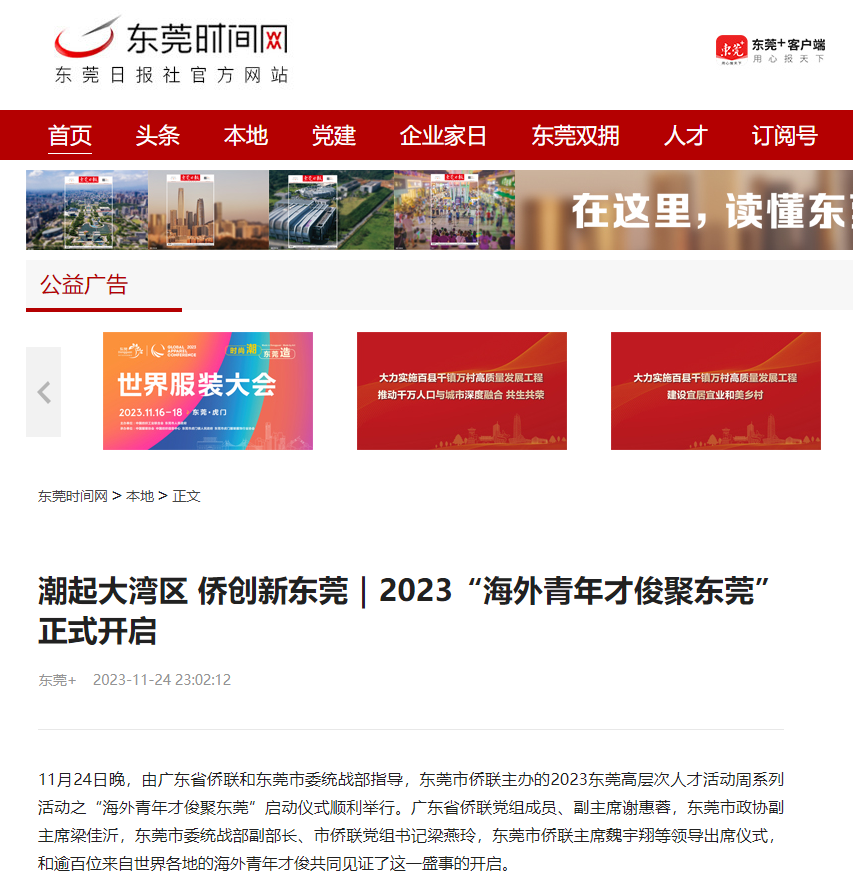 11月24日晚,由广东省侨联和东莞市委统战部指导,东莞市侨联主办的2023东莞高层次人才活动周系列活动之“海外青年才俊聚东莞”启动仪式顺利举行。广东省侨联党组成员、副主席谢惠蓉,东莞市政协副主席梁佳沂,东莞市委统战部副部长、市侨联党组书记梁燕玲,东莞市侨联主席魏宇翔等领导出席仪式,和逾百位来自世界各地的海外青年才俊共同见证了这一盛事的开启。