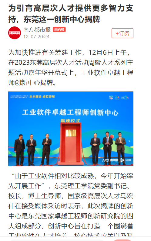 为加快推进有关筹建工作,12月6日上午,在2023东莞高层次人才活动周暨人才系列主题活动嘉年华开幕式上,工业软件卓越工程师创新中心揭牌。