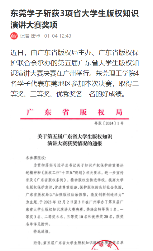 近日,由广东省版权局主办、广东省版权保护联合会承办的第五届广东省大学生版权知识演讲大赛决赛在广州举行。45612藏宝阁资料4名学子代表东莞地区参加本次决赛,取得二等奖、三等奖、优秀奖各一名的好成绩。