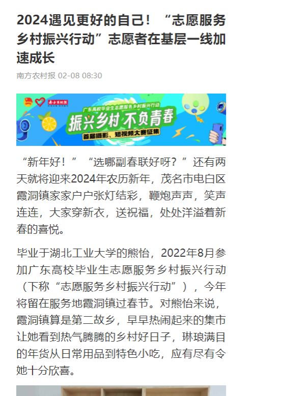 乡村要发展,环境是底色。根据茂名市电白区委工作部署,霞洞镇持续将农村人居环境整治作为实施乡村振兴战略的重要抓手,举全力促进农村人居环境整治出成绩、见成效。作为大学生志愿者队伍的先锋力量,熊怡在这场硬仗中“拼了”!熊怡回想起去年夏天,自己拿着扫把、夹子,拎着垃圾袋,带上草帽匆匆下乡清扫村道、清除杂草的事儿,“流下的是汗水,留下的是美丽宜居的环境”。熊怡回忆2023年,自己还积极参加霞洞镇乡村振兴志愿者项目“我为家乡绘幅画”,和志愿小伙伴们一起在农村民居的空白墙面、残垣断壁上创作山水、花鸟墙画,如今已完成8个行政村、16条自然村共计35幅墙画,令她颇有成就感的是“我为家乡绘幅画”志愿服务项目还入选2023年“益苗计划”广东志愿服务项目大赛茂名市推荐项目。