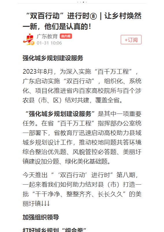 组建省“百县千镇万村高质量发展工程”指挥部“双百行动”专班和省教育厅“双百行动”工作专班“双专班”,为高校助力县域城乡规划设计提供组织保障。