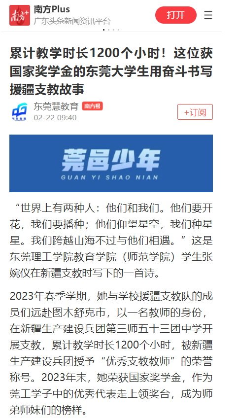 2023年春季学期,她与学校援疆支教队的成员们远赴图木舒克市,以一名教师的身份,在新疆生产建设兵团第三师五十三团中学开展支教,累计教学时长1200个小时,被新疆生产建设兵团授予“优秀支教教师”的荣誉称号。2023年末,她荣获国家奖学金,作为莞工学子中的优秀代表走上领奖台,成为师弟师妹们的榜样。