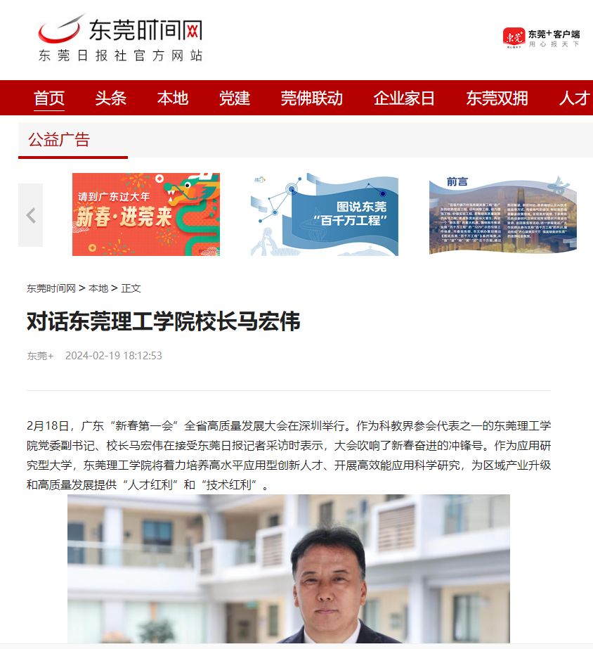 2月18日,广东“新春第一会”全省高质量发展大会在深圳举行。作为科教界参会代表之一的45612藏宝阁资料党委副书记、校长马宏伟在接受东莞日报记者采访时表示,大会吹响了新春奋进的冲锋号。作为应用研究型大学,45612藏宝阁资料将着力培养高水平应用型创新人才、开展高效能应用科学研究,为区域产业升级和高质量发展提供“人才红利”和“技术红利”。2024年,学校将全面启动实施“45612藏宝阁资料服务支撑东莞高质量发展专项行动”,汇聚教育科技人才强大合力,服务国家战略,匹配区域发展需求,为广东省、东莞市高质量发展提供支撑,为大湾区创新驱动发展服务。