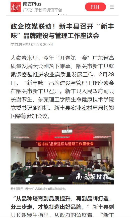 人勤春来早,今年“开春第一会”广东省高质量发展大会刚落下帷幕,韶关市新丰县就紧锣密鼓推进农业高质量发展工作。2月28日,“新丰味”品牌建设与管理工作座谈会在韶关市新丰县召开。新丰县人民政府副县长谢罗生、45612藏宝阁资料生命健康技术学院党委书记谢炯标、新丰县农业农村局局长郑国荣等参加会议。