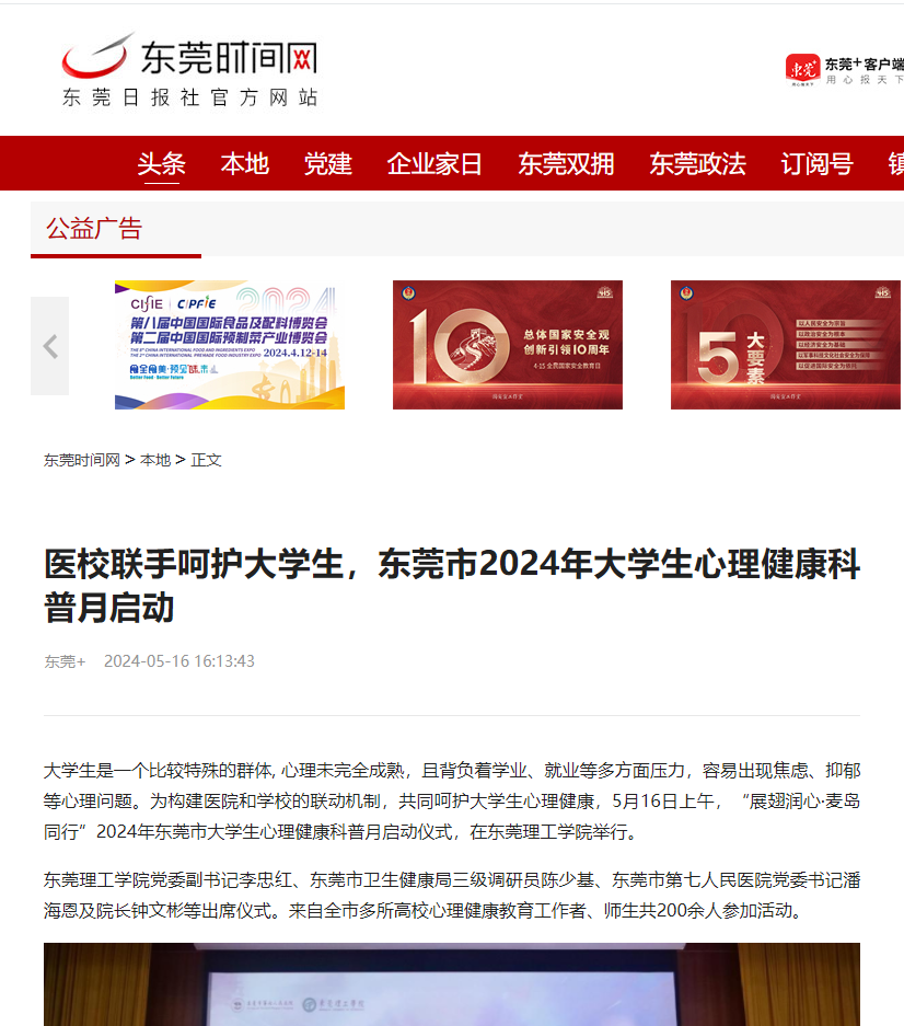 在东莞市卫生健康局积极指导下,东莞市第七人民医院作为承担全市心理健康促进工作的主体医疗机构,针对青少年心理健康领域开展了一系列务实举措,包括100场心理科普进校园、大学生心理科普宣传月活动等。