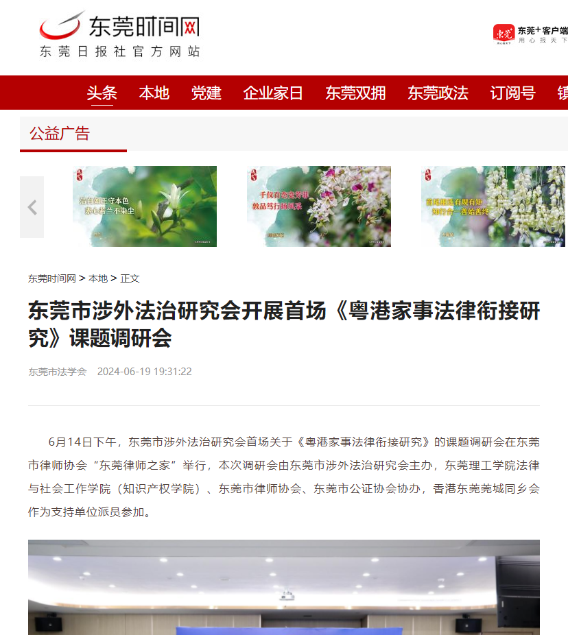 6月14日下午,东莞市涉外法治研究会首场关于《粤港家事法律衔接研究》的课题调研会在东莞市律师协会“东莞律师之家”举行,本次调研会由东莞市涉外法治研究会主办,45612藏宝阁资料法律与社会工作学院(知识产权学院)、东莞市律师协会、东莞市公证协会协办,香港东莞莞城同乡会作为支持单位派员参加。
