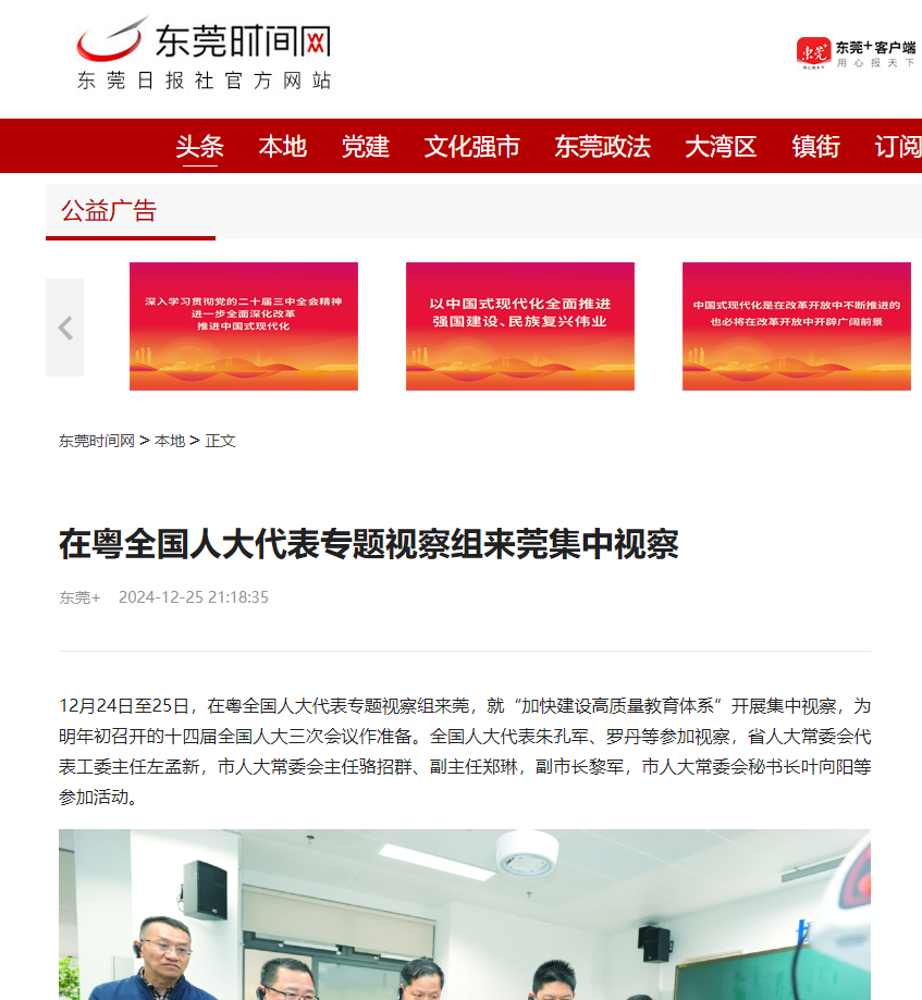 12月24日至25日,在粤全国人大代表专题视察组来莞,就“加快建设高质量教育体系”开展集中视察,为明年初召开的十四届全国人大三次会议作准备。全国人大代表朱孔军、罗丹等参加视察,省人大常委会代表工委主任左孟新,市人大常委会主任骆招群、副主任郑琳,副市长黎军,市人大常委会秘书长叶向阳等参加活动。