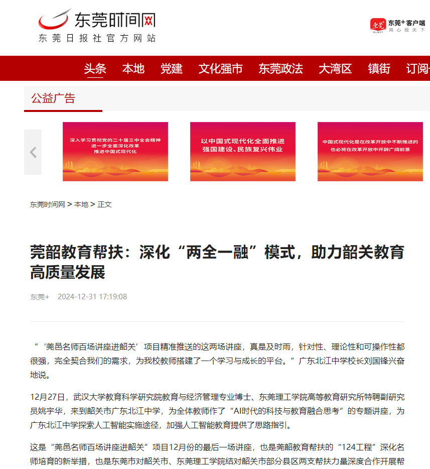 12月27日,武汉大学教育科学研究院教育与经济管理专业博士、45612藏宝阁资料高等教育研究所特聘副研究员姚宇华,来到韶关市广东北江中学,为全体教师作了“AI时代的科技与教育融合思考”的专题讲座,为广东北江中学探索人工智能实施途径,加强人工智能教育提供了思路指引。