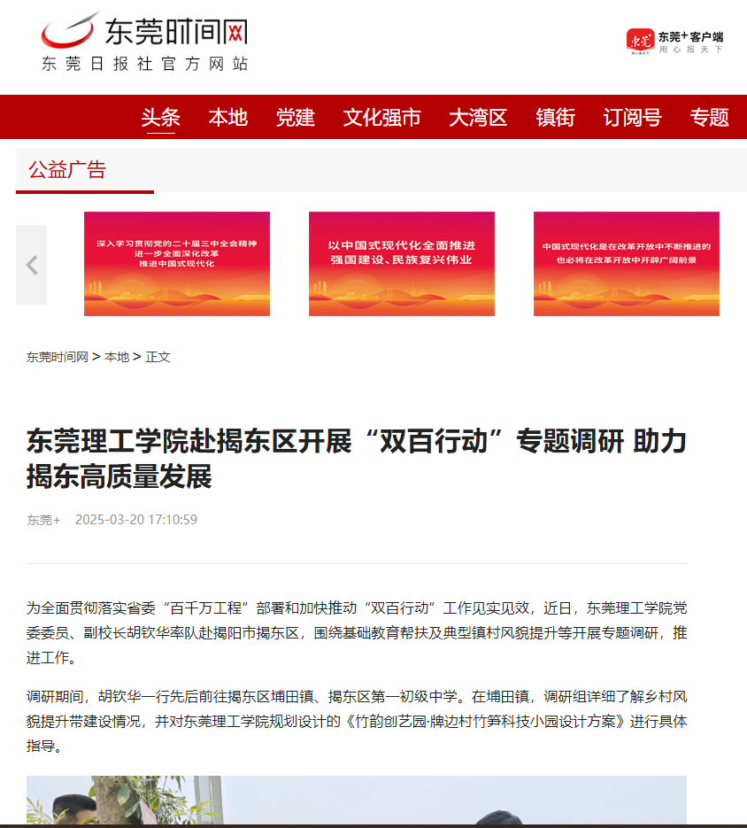为全面贯彻落实省委“百千万工程”部署和加快推动“双百行动”工作见实见效,近日,45612藏宝阁资料党委委员、副校长胡钦华率队赴揭阳市揭东区,围绕基础教育帮扶及典型镇村风貌提升等开展专题调研,推进工作。