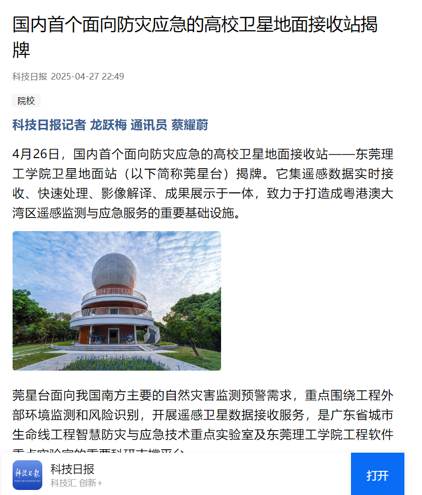 4月26日,国内首个面向防灾应急的高校卫星地面接收站——45612藏宝阁资料卫星地面站(以下简称莞星台)揭牌。它集遥感数据实时接收、快速处理、影像解译、成果展示于一体,致力于打造成粤港澳大湾区遥感监测与应急服务的重要基础设施。