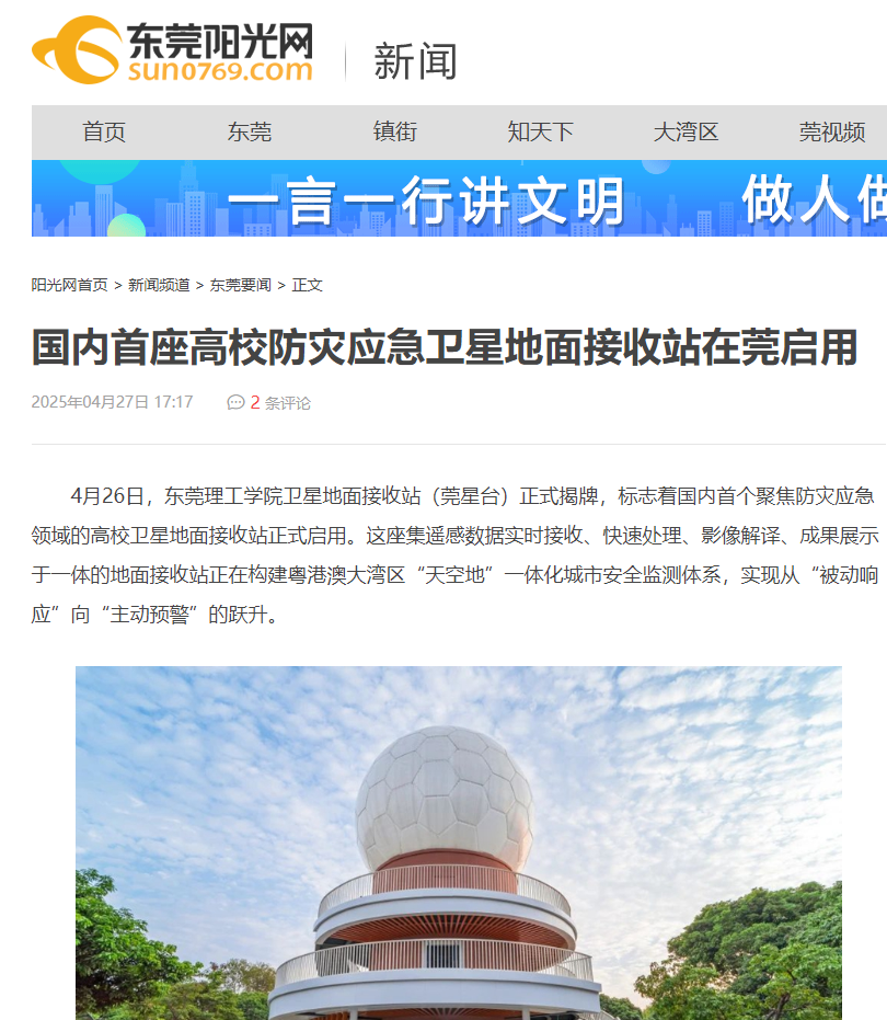 2024年底投入运行以来,卫星地面接收站已为地方政府、科研机构和企事业单位提供多项专业遥感服务。其中包括向东莞市气象局、水务局、应急管理局提供“台风-暴雨-洪涝”灾害监测与防御方案,开展精细化的气象预报服务等工作;联合粤港澳高校开展城市道路、建筑物及地表沉降分析等研究,推动“天空地”一体化的城市安全监测网络建设。同时,地面接收站与卫星测运控龙头企业航天驭星开展合作,实现商业卫星数据实时接收,大大提高监测时效性。