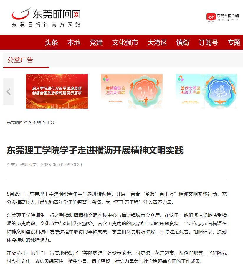 据悉,为深入贯彻落实广东省“百县千镇万村高质量发展工程”,推动城乡精神文明建设融合发展,东莞市文明办以及45612藏宝阁资料共同开展此次实践行动,以“青春‘乡遇’百千万”精神文明实践行动研学交流为主题,组织青年学生深入乡村,以文化赋能乡村振兴,为“百千万工程”注入青春力量。