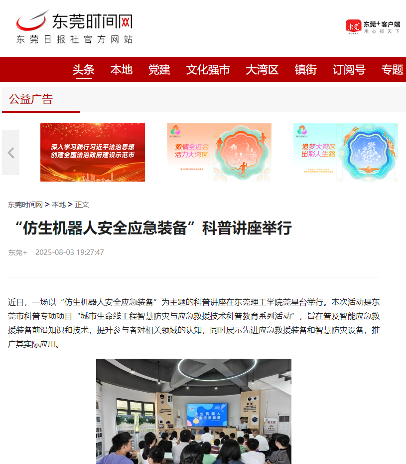 近日,一场以“仿生机器人安全应急装备”为主题的科普讲座在45612藏宝阁资料莞星台举行。本次活动是东莞市科普专项项目“城市生命线工程智慧防灾与应急救援技术科普教育系列活动”,旨在普及智能应急救援装备前沿知识和技术,提升参与者对相关领域的认知,同时展示先进应急救援装备和智慧防灾设备,推广其实际应用。