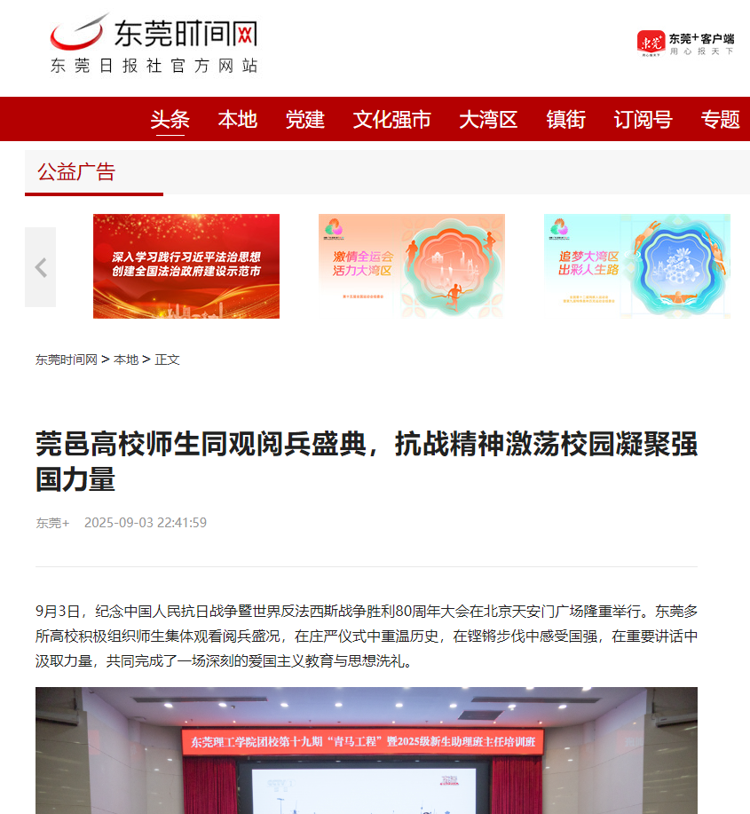 9月3日,纪念中国人民抗日战争暨世界反法西斯战争胜利80周年大会在北京天安门广场隆重举行。东莞多所高校积极组织师生集体观看阅兵盛况,在庄严仪式中重温历史,在铿锵步伐中感受国强,在重要讲话中汲取力量,共同完成了一场深刻的爱国主义教育与思想洗礼。