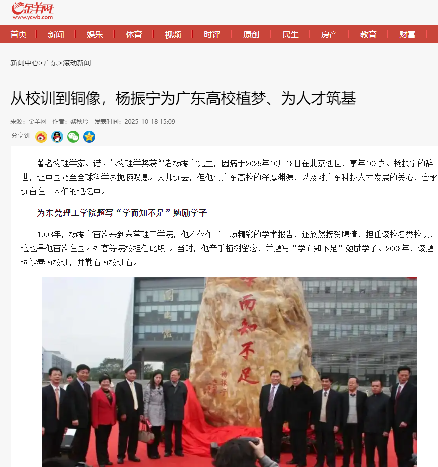 著名物理学家、诺贝尔物理学奖获得者杨振宁先生,因病于2025年10月18日在北京逝世,享年103岁。杨振宁的辞世,让中国乃至全球科学界扼腕叹息。大师远去,但他与广东高校的深厚渊源,以及对广东科技人才发展的关心,会永远留在了人们的记忆中。