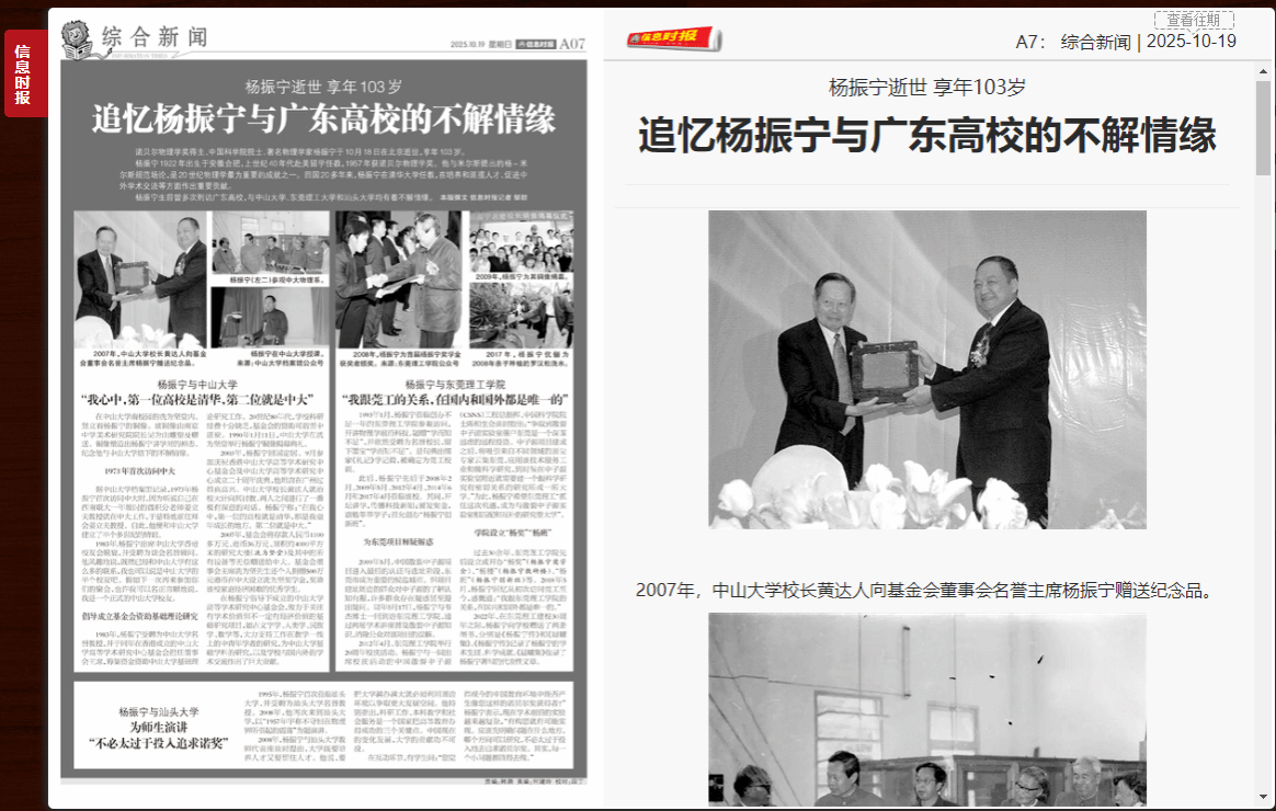 杨振宁生前曾多次到访广东高校,与中山大学、东莞理工大学和汕头大学均有着不解情缘。