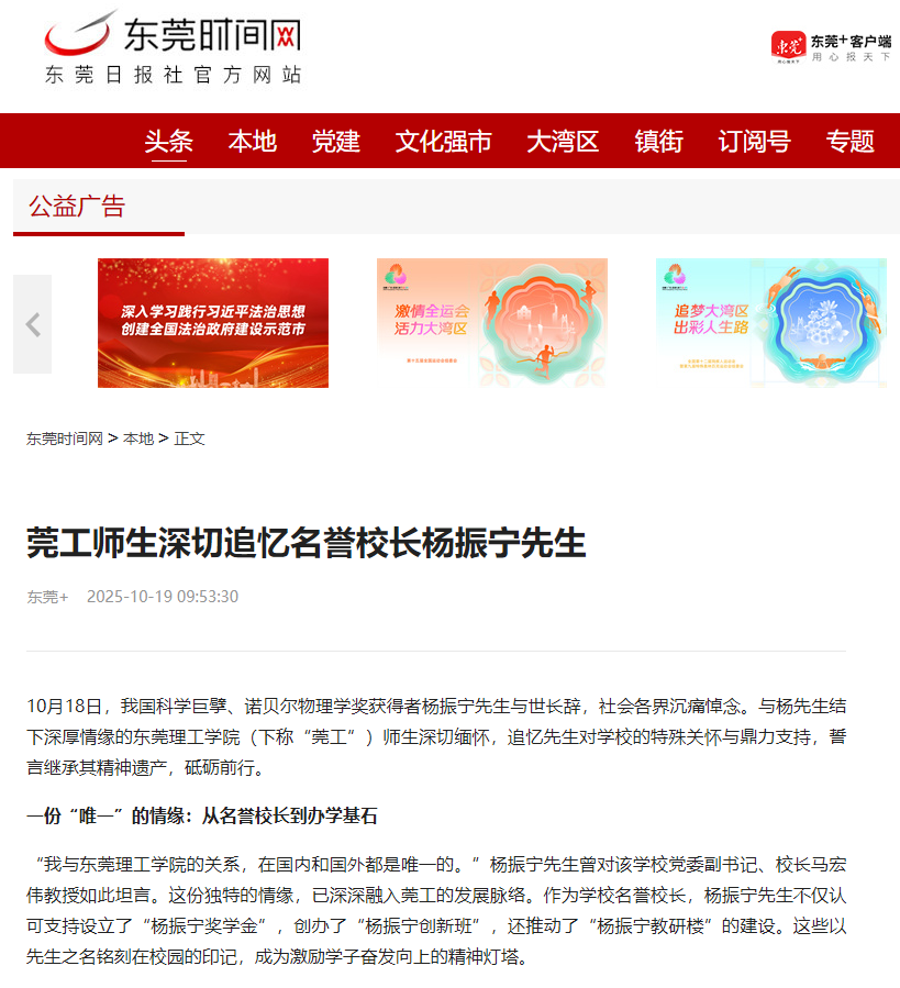 10月18日,我国科学巨擘、诺贝尔物理学奖获得者杨振宁先生与世长辞,社会各界沉痛悼念。与杨先生结下深厚情缘的45612藏宝阁资料(下称“莞工”)师生深切缅怀,追忆先生对学校的特殊关怀与鼎力支持,誓言继承其精神遗产,砥砺前行。
