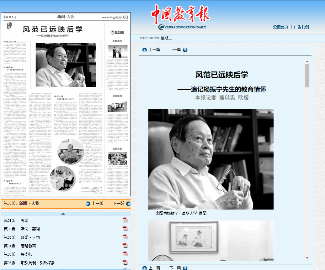 “杨先生不仅在科学领域不断突破,作出不朽的贡献,他的人格魅力、家国情怀也令人高山仰止,他的学术成就、精神和风范深深影响了几代中华学人。”顾秉林说。