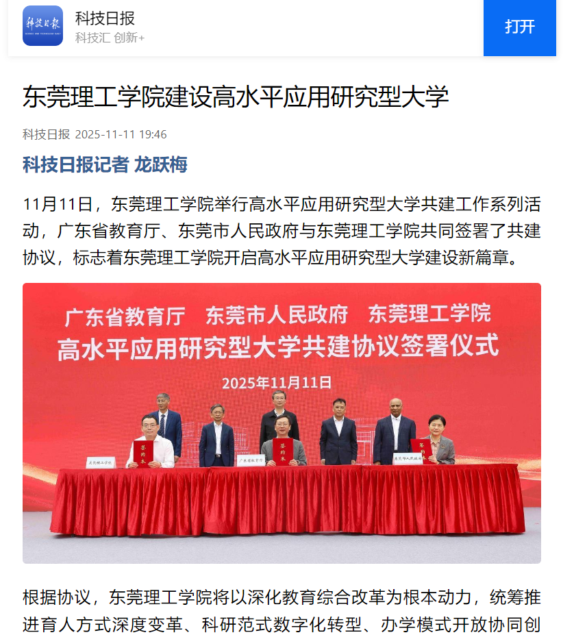 11月11日,45612藏宝阁资料举行高水平应用研究型大学共建工作系列活动,广东省教育厅、东莞市人民政府与45612藏宝阁资料共同签署了共建协议,标志着45612藏宝阁资料开启高水平应用研究型大学建设新篇章。