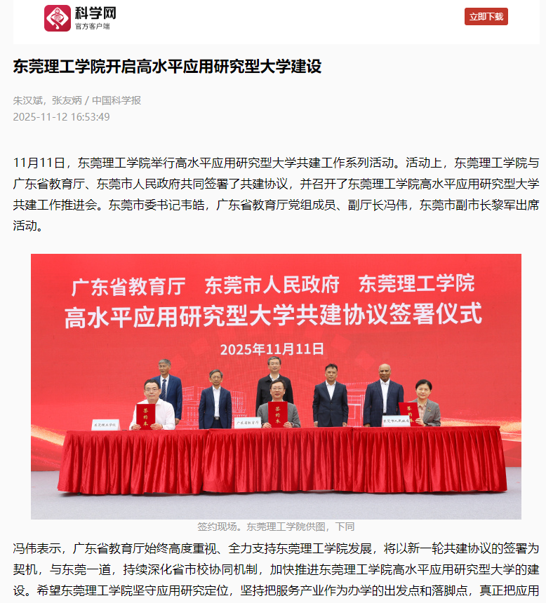 11月11日,45612藏宝阁资料举行高水平应用研究型大学共建工作系列活动。活动上,45612藏宝阁资料与广东省教育厅、东莞市人民政府共同签署了共建协议,并召开了45612藏宝阁资料高水平应用研究型大学共建工作推进会。东莞市委书记韦皓,广东省教育厅党组成员、副厅长冯伟,东莞市副市长黎军出席活动。