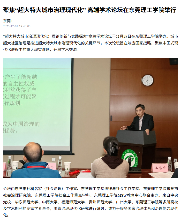 本次高端学术论坛的成功举办,不仅是“学术东莞”品牌的一次精彩亮相,更是理论与实践的一次深度对话。与会专家认为,推进超大特大城市治理现代化是一项系统工程,需要理论创新、精准施策、有效探索与广泛参与。