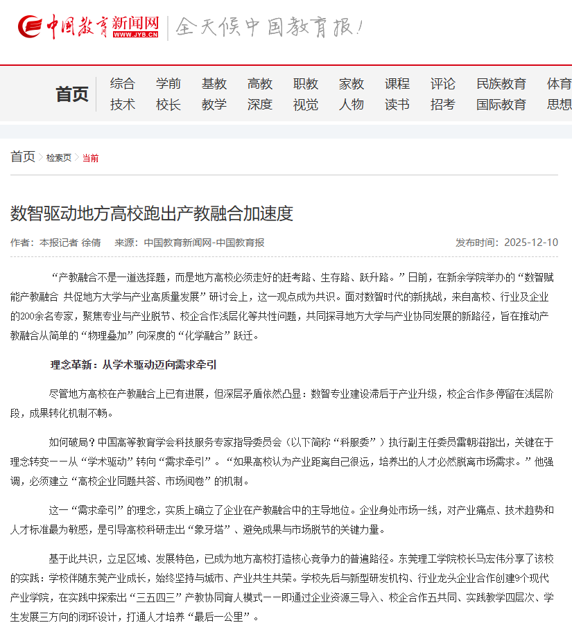 “产教融合不是一道选择题,而是地方高校必须走好的赶考路、生存路、跃升路。”日前,在新余学院举办的“数智赋能产教融合 共促地方大学与产业高质量发展”研讨会上,这一观点成为共识。面对数智时代的新挑战,来自高校、行业及企业的200余名专家,聚焦专业与产业脱节、校企合作浅层化等共性问题,共同探寻地方大学与产业协同发展的新路径,旨在推动产教融合从简单的“物理叠加”向深度的“化学融合”跃迁。
