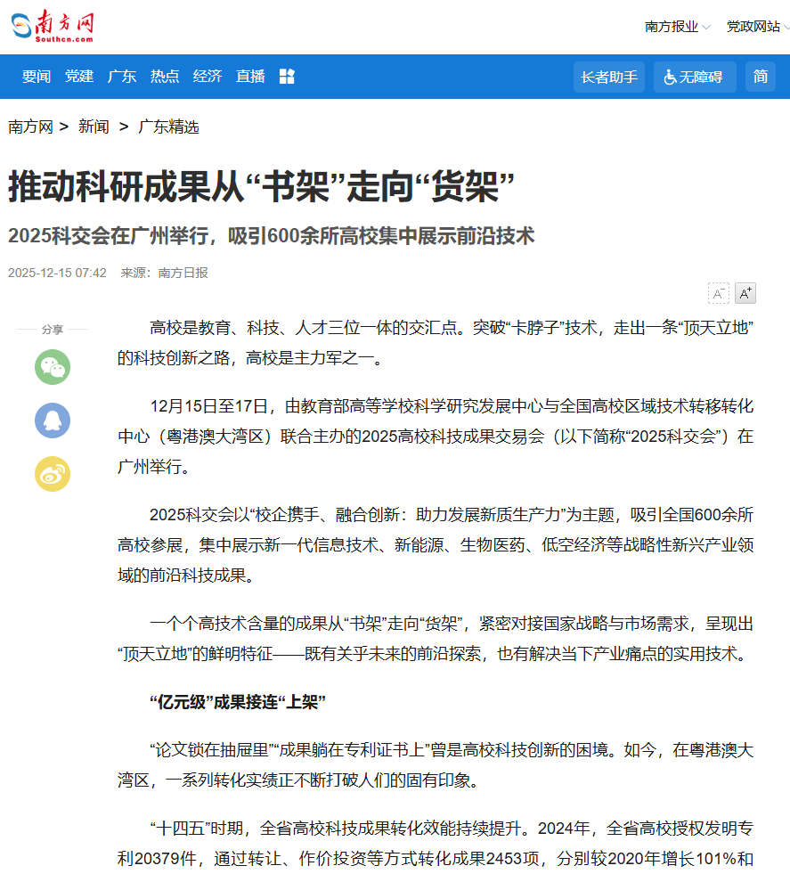 12月15日至17日,由教育部高等学校科学研究发展中心与全国高校区域技术转移转化中心(粤港澳大湾区)联合主办的2025高校科技成果交易会(以下简称“2025科交会”)在广州举行。
