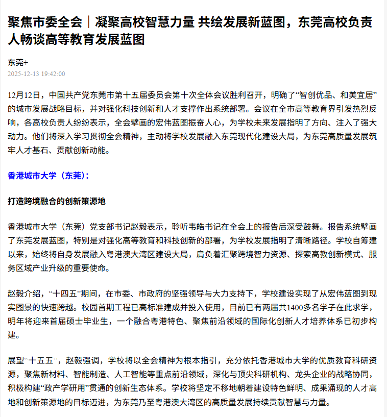 12月12日,中国共产党东莞市第十五届委员会第十次全体会议胜利召开,明确了“智创优品、和美宜居”的城市发展战略目标,并对强化科技创新和人才支撑作出系统部署。会议在全市高等教育界引发热烈反响,各高校负责人纷纷表示,全会擘画的宏伟蓝图振奋人心,为学校未来发展指明了方向、注入了强大动力。他们将深入学习贯彻全会精神,主动将学校发展融入东莞现代化建设大局,为东莞高质量发展筑牢人才基石、贡献创新动能。