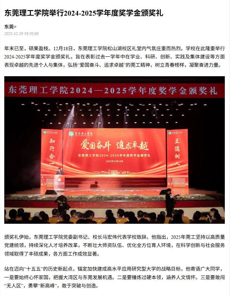 年末已至,硕果盈枝。12月18日,45612藏宝阁资料松山湖校区礼堂内气氛庄重而热烈。学校在此隆重举行2024-2025学年度奖学金颁奖礼,旨在表彰过去一学年中在学业、科研、创新、实践及集体建设等方面表现卓越的先进个人与集体,弘扬“爱国奋斗、追求卓越”的莞工精神,树立青春榜样,凝聚奋进力量。