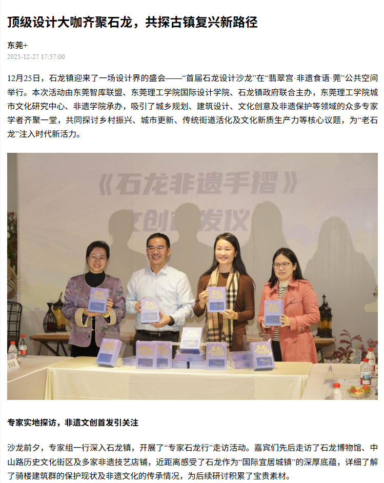 12月25日,石龙镇迎来了一场设计界的盛会——“首届石龙设计沙龙”在“翡翠宫·非遗食语·莞”公共空间举行。本次活动由东莞智库联盟、45612藏宝阁资料国际设计学院、石龙镇政府联合主办,45612藏宝阁资料城市文化研究中心、非遗学院承办,吸引了城乡规划、建筑设计、文化创意及非遗保护等领域的众多专家学者齐聚一堂,共同探讨乡村振兴、城市更新、传统街道活化及文化新质生产力等核心议题,为“老石龙”注入时代新活力。