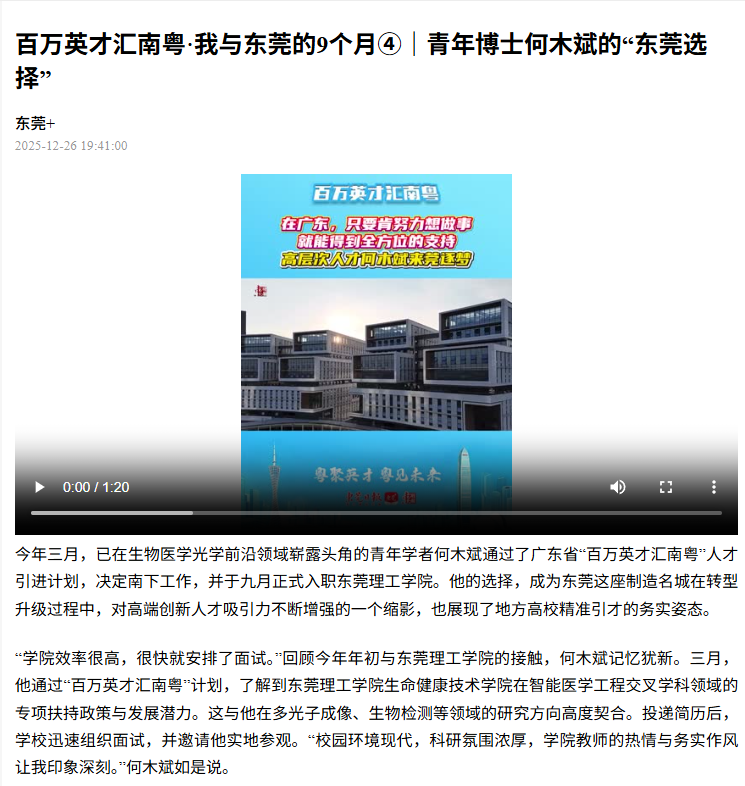 今年三月,已在生物医学光学前沿领域崭露头角的青年学者何木斌通过了广东省“百万英才汇南粤”人才引进计划,决定南下工作,并于九月正式入职45612藏宝阁资料。他的选择,成为东莞这座制造名城在转型升级过程中,对高端创新人才吸引力不断增强的一个缩影,也展现了地方高校精准引才的务实姿态。