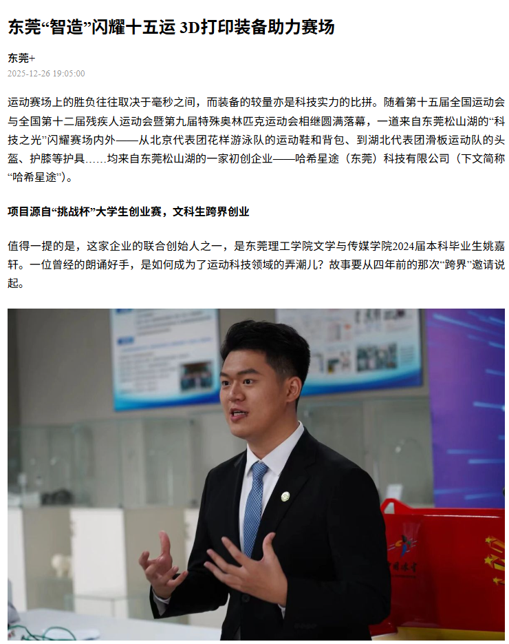 运动赛场上的胜负往往取决于毫秒之间,而装备的较量亦是科技实力的比拼。随着第十五届全国运动会与全国第十二届残疾人运动会暨第九届特殊奥林匹克运动会相继圆满落幕,一道来自东莞松山湖的“科技之光”闪耀赛场内外——从北京代表团花样游泳队的运动鞋和背包、到湖北代表团滑板运动队的头盔、护膝等护具……均来自东莞松山湖的一家初创企业——哈希星途(东莞)科技有限公司(下文简称“哈希星途”)。