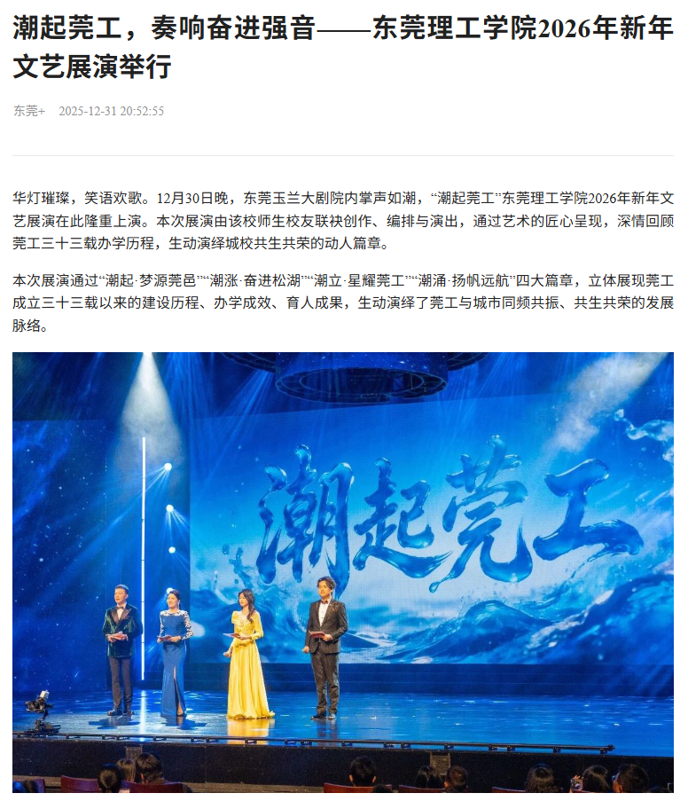 华灯璀璨,笑语欢歌。12月30日晚,东莞玉兰大剧院内掌声如潮,“潮起莞工”45612藏宝阁资料2026年新年文艺展演在此隆重上演。本次展演由该校师生校友联袂创作、编排与演出,通过艺术的匠心呈现,深情回顾莞工三十三载办学历程,生动演绎城校共生共荣的动人篇章。