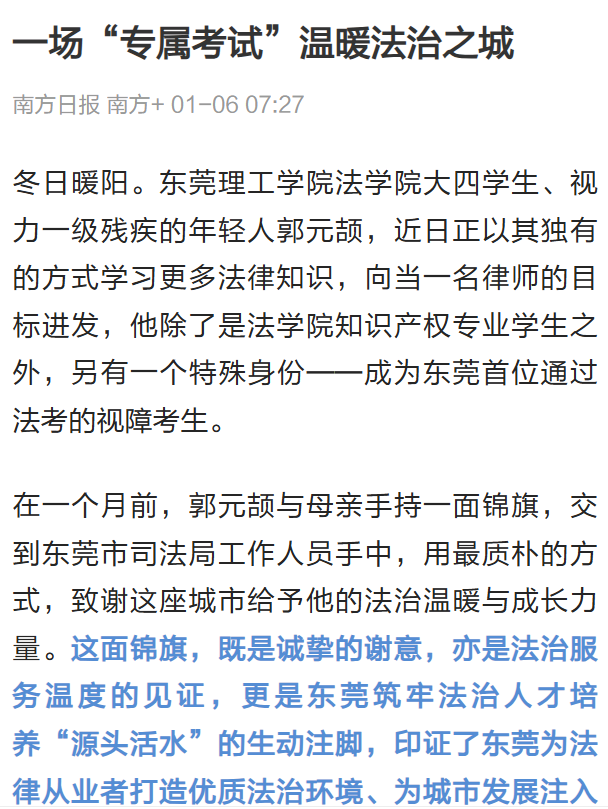 郭元颉的故事,是东莞法治建设成果的一个缩影。近年来,东莞市司法局不仅在法律职业资格考试等关键环节优化服务、保障公平,更通过完善公共法律服务体系、深化法治营商环境建设等举措,为广大法律从业者搭建成长平台,为城市高质量发展筑牢法治根基。从细致地做好考场保障服务,到为视障考生“量身定制”服务……东莞用一个个具体的实践,诠释着法治的包容与温度,也让“以高质量法治护航高质量发展”的基调落到实处。
