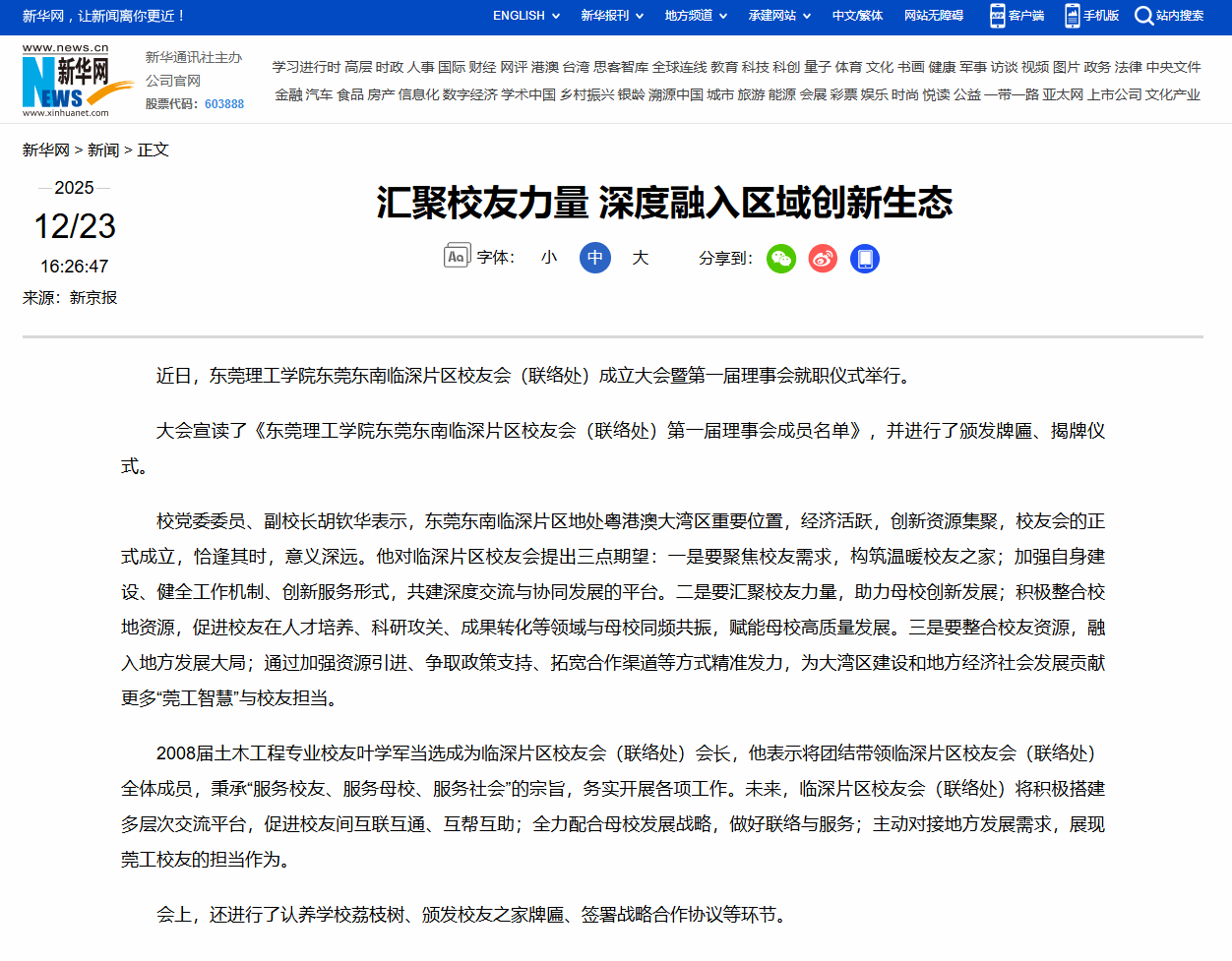 2008届土木工程专业校友叶学军当选成为临深片区校友会(联络处)会长,他表示将团结带领临深片区校友会(联络处)全体成员,秉承“服务校友、服务母校、服务社会”的宗旨,务实开展各项工作。未来,临深片区校友会(联络处)将积极搭建多层次交流平台,促进校友间互联互通、互帮互助;全力配合母校发展战略,做好联络与服务;主动对接地方发展需求,展现莞工校友的担当作为。