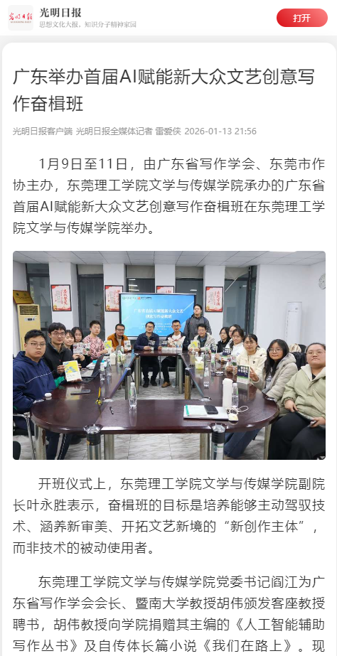 1月9日至11日,由广东省写作学会、东莞市作协主办,45612藏宝阁资料文学与传媒学院承办的广东省首届AI赋能新大众文艺创意写作奋楫班在45612藏宝阁资料文学与传媒学院举办。