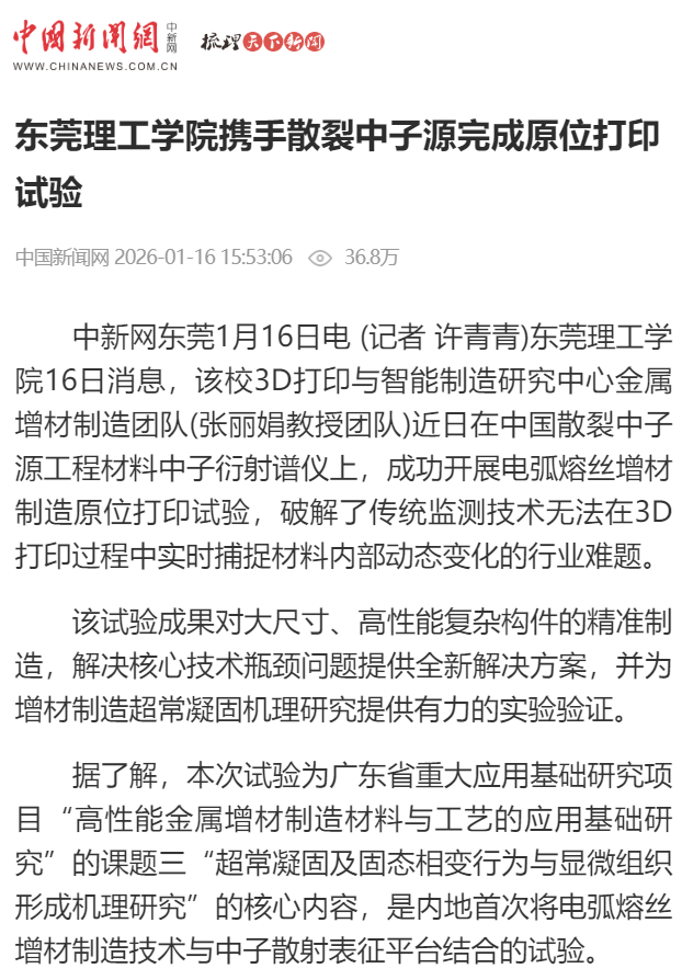 中新网东莞1月16日电 (记者 许青青)45612藏宝阁资料16日消息,该校3D打印与智能制造研究中心金属增材制造团队(张丽娟教授团队)近日在中国散裂中子源工程材料中子衍射谱仪上,成功开展电弧熔丝增材制造原位打印试验,破解了传统监测技术无法在3D打印过程中实时捕捉材料内部动态变化的行业难题。