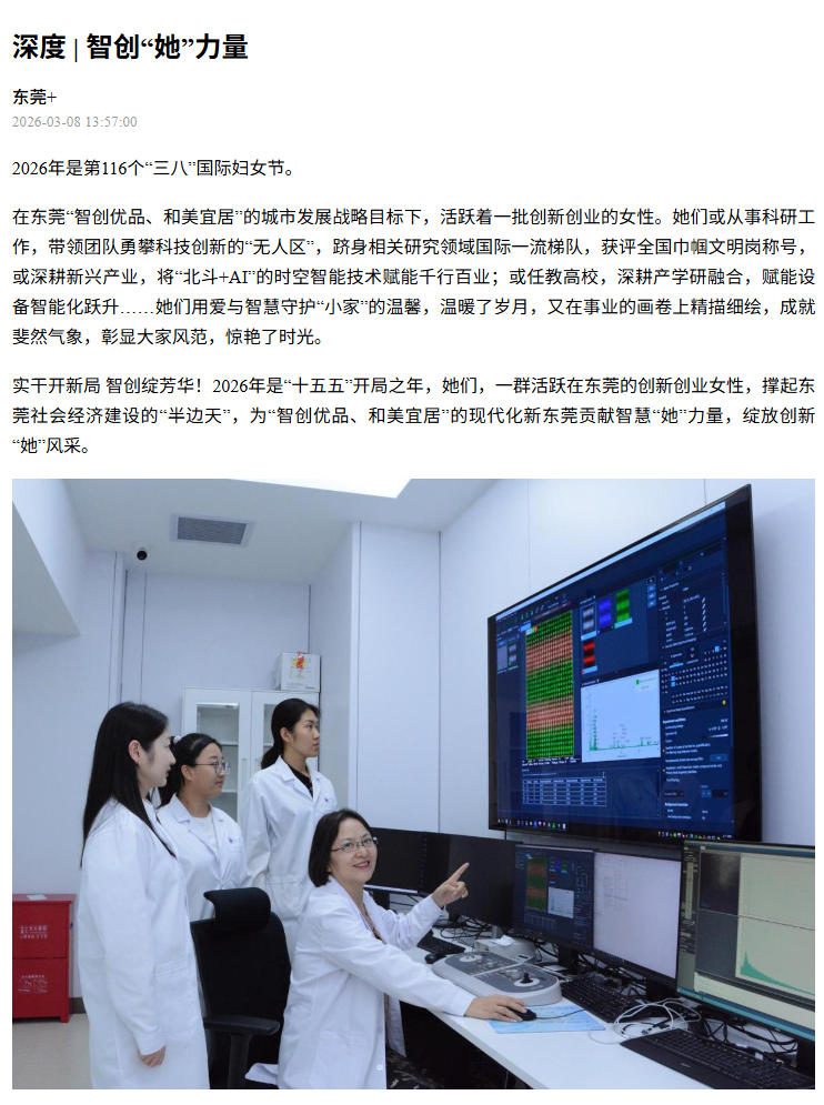 温柔和理性兼具、家庭与事业共进,已成为女性科研工作者、创业者的常态,更展现了她们“巾帼不让须眉”的智慧,为东莞这座城市的创新发展提供了不可或缺的“她”力量与“她”智慧。