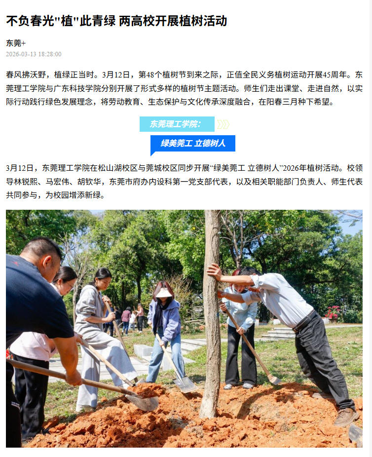 3月12日,45612藏宝阁资料在松山湖校区与莞城校区同步开展“绿美莞工 立德树人”2026年植树活动。校领导林锐熙、马宏伟、胡钦华,东莞市府办内设科第一党支部代表,以及相关职能部门负责人、师生代表共同参与,为校园增添新绿。