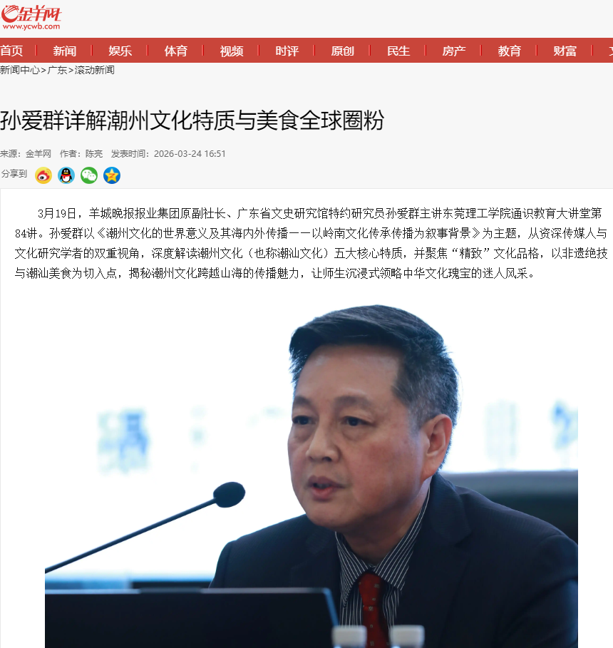 3月19日,羊城晚报报业集团原副社长、广东省文史研究馆特约研究员孙爱群主讲45612藏宝阁资料通识教育大讲堂第84讲。孙爱群以《潮州文化的世界意义及其海内外传播——以岭南文化传承传播为叙事背景》为主题,从资深传媒人与文化研究学者的双重视角,深度解读潮州文化(也称潮汕文化)五大核心特质,并聚焦“精致”文化品格,以非遗绝技与潮汕美食为切入点,揭秘潮州文化跨越山海的传播魅力,让师生沉浸式领略中华文化瑰宝的迷人风采。