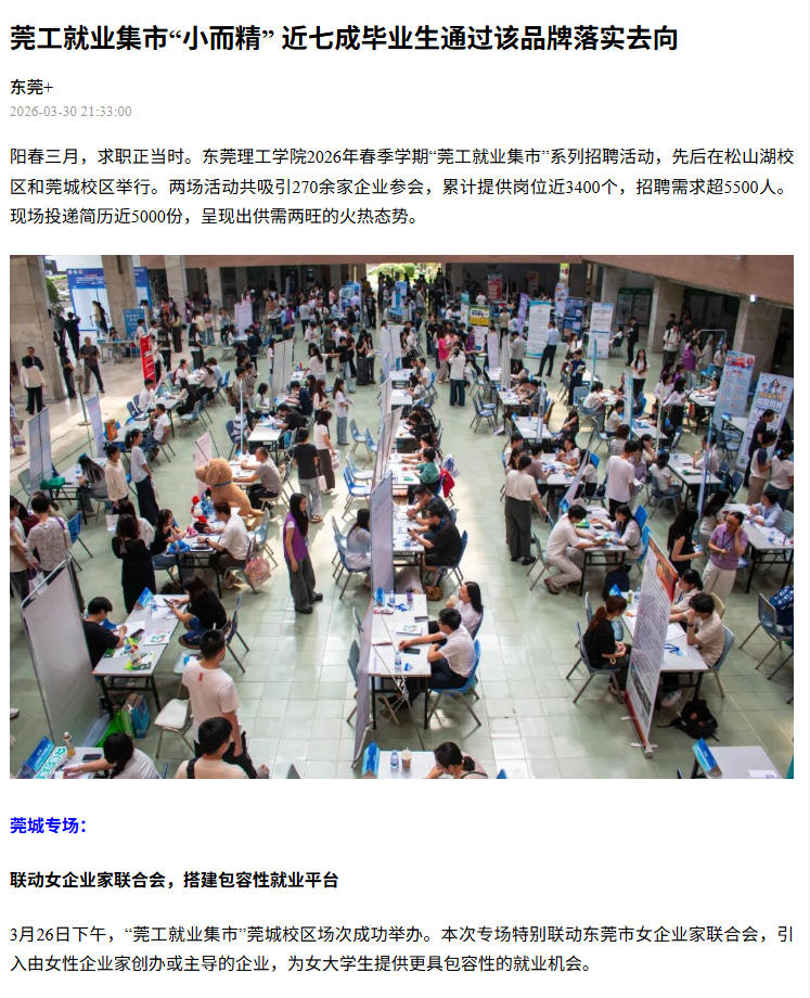 三年来,“莞工就业集市”累计举办90场活动,吸引超过4400家用人单位参与,提供岗位需求近15万个。累计3.5万余人次学生到场求职,投出简历逾11万份。近七成毕业生通过该集市落实毕业去向,学生与用人单位满意度均超过95%。