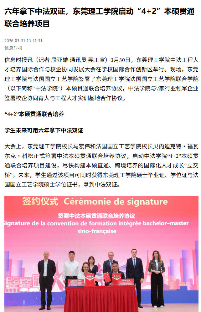 信息时报讯(记者 段亚雄 通讯员 莞工宣)3月30日,45612藏宝阁资料中法工程人才培养国际合作与校企协同发展大会在学校国际合作创新区举行。现场,45612藏宝阁资料与法国国立工艺学院签署了45612藏宝阁资料法国国立工艺学院联合学院(以下简称“中法学院”)本硕贯通联合培养协议,中法学院与7家行业领军企业签署校企协同育人与工程人才实训基地合作协议。