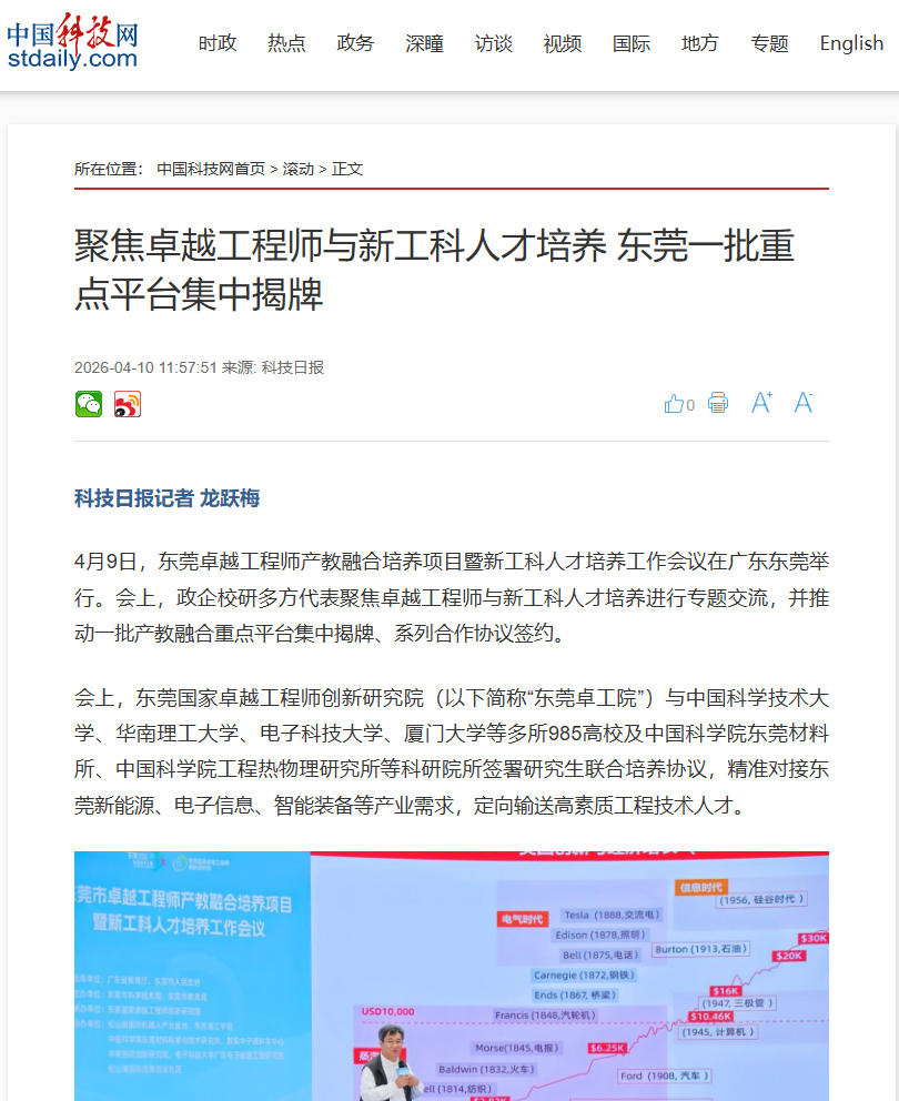 4月9日,东莞卓越工程师产教融合培养项目暨新工科人才培养工作会议在广东东莞举行。会上,政企校研多方代表聚焦卓越工程师与新工科人才培养进行专题交流,并推动一批产教融合重点平台集中揭牌、系列合作协议签约。
