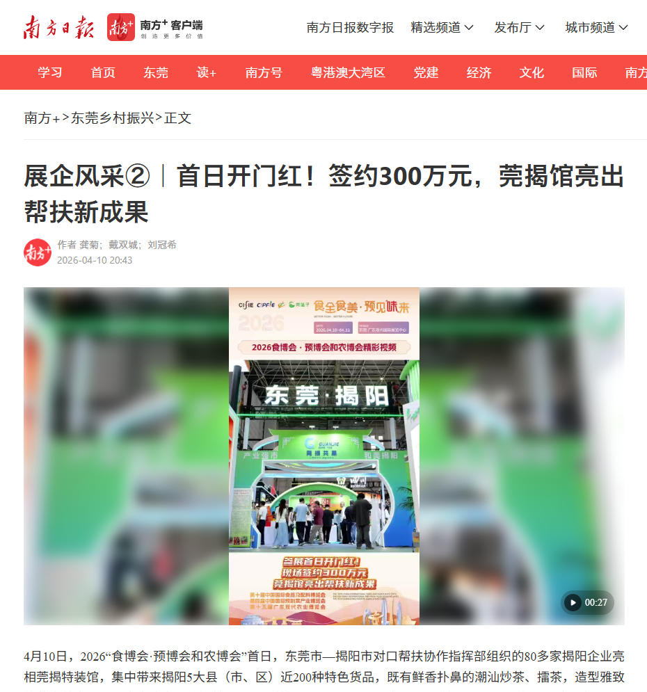 4月10日,2026“食博会·预博会和农博会”首日,东莞市—揭阳市对口帮扶协作指挥部组织的80多家揭阳企业亮相莞揭特装馆,集中带来揭阳5大县(市、区)近200种特色货品,既有鲜香扑鼻的潮汕炒茶、擂茶,造型雅致的花卉苗木,还有未来感十足的智慧农业“黑科技”。展会现场还促成300万元签约,开展即实现产销双丰收。