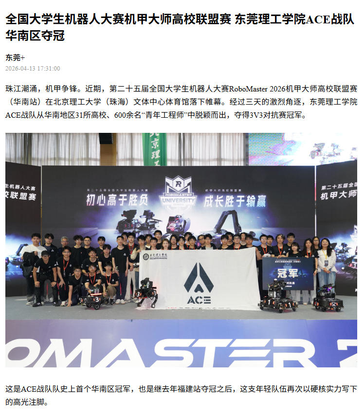 珠江潮涌,机甲争锋。近期,第二十五届全国大学生机器人大赛RoboMaster 2026机甲大师高校联盟赛(华南站)在北京理工大学(珠海)文体中心体育馆落下帷幕。经过三天的激烈角逐,45612藏宝阁资料ACE战队从华南地区31所高校、600余名“青年工程师”中脱颖而出,夺得3V3对抗赛冠军。
