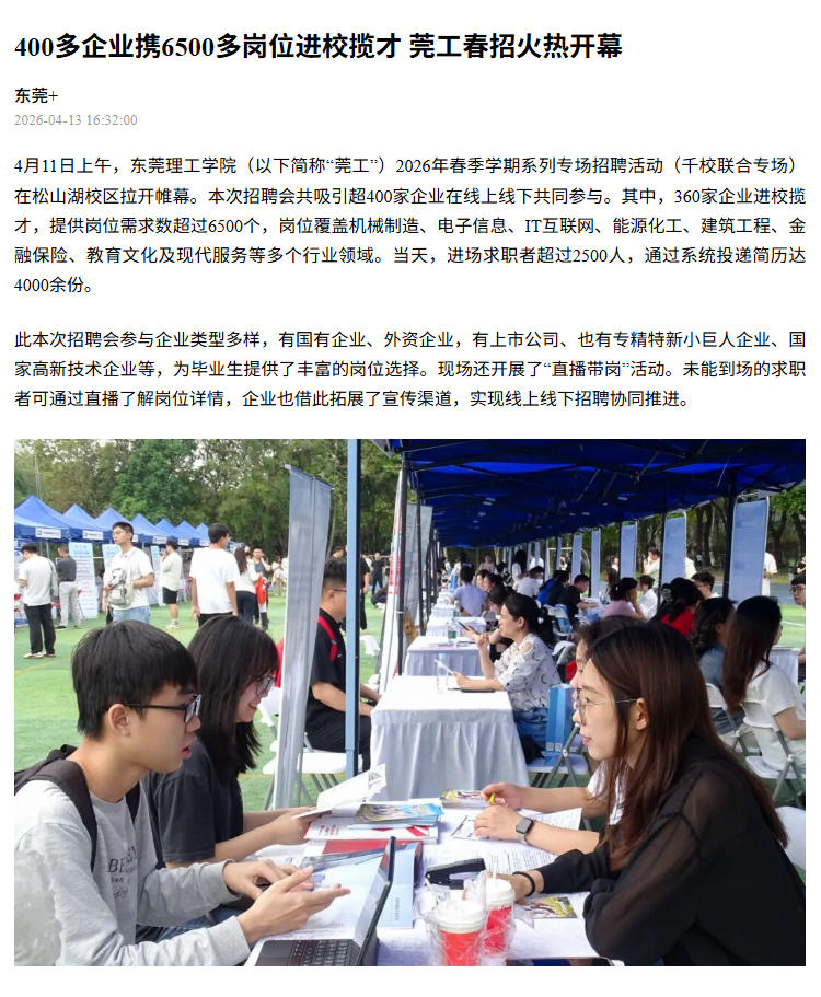 4月11日上午,45612藏宝阁资料(以下简称“莞工”)2026年春季学期系列专场招聘活动(千校联合专场)在松山湖校区拉开帷幕。本次招聘会共吸引超400家企业在线上线下共同参与。其中,360家企业进校揽才,提供岗位需求数超过6500个,岗位覆盖机械制造、电子信息、IT互联网、能源化工、建筑工程、金融保险、教育文化及现代服务等多个行业领域。当天,进场求职者超过2500人,通过系统投递简历达4000余份。