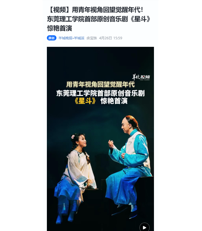 落地东莞本土语境,《星斗》更是一次城市精神与青年力量的深度绑定。东莞既是近代史开篇地,也是制造业名城、青春之城;虎门的觉醒风骨、寮步的莞香文脉,共同构成了这座城市的精神根脉。《星斗》将非遗莞香、岭南民俗、虎门记忆融为一体,让本土文化不再是陈列的符号,而是活在舞台上、流淌在旋律中的生命力量。它证明:本土原创并非局限于地域叙事,而是可以立足本土、放眼时代,用艺术讲好中国故事、青年故事;高校文艺也并非象牙塔内的自娱自乐,而是可以扎根城市文脉、回应时代命题,成为文化强市建设的鲜活力量。