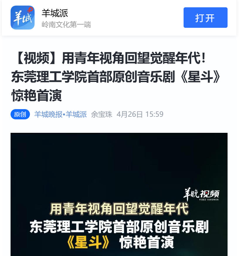 落地东莞本土语境,《星斗》更是一次城市精神与青年力量的深度绑定。东莞既是近代史开篇地,也是制造业名城、青春之城;虎门的觉醒风骨、寮步的莞香文脉,共同构成了这座城市的精神根脉。《星斗》将非遗莞香、岭南民俗、虎门记忆融为一体,让本土文化不再是陈列的符号,而是活在舞台上、流淌在旋律中的生命力量。它证明:本土原创并非局限于地域叙事,而是可以立足本土、放眼时代,用艺术讲好中国故事、青年故事;高校文艺也并非象牙塔内的自娱自乐,而是可以扎根城市文脉、回应时代命题,成为文化强市建设的鲜活力量。